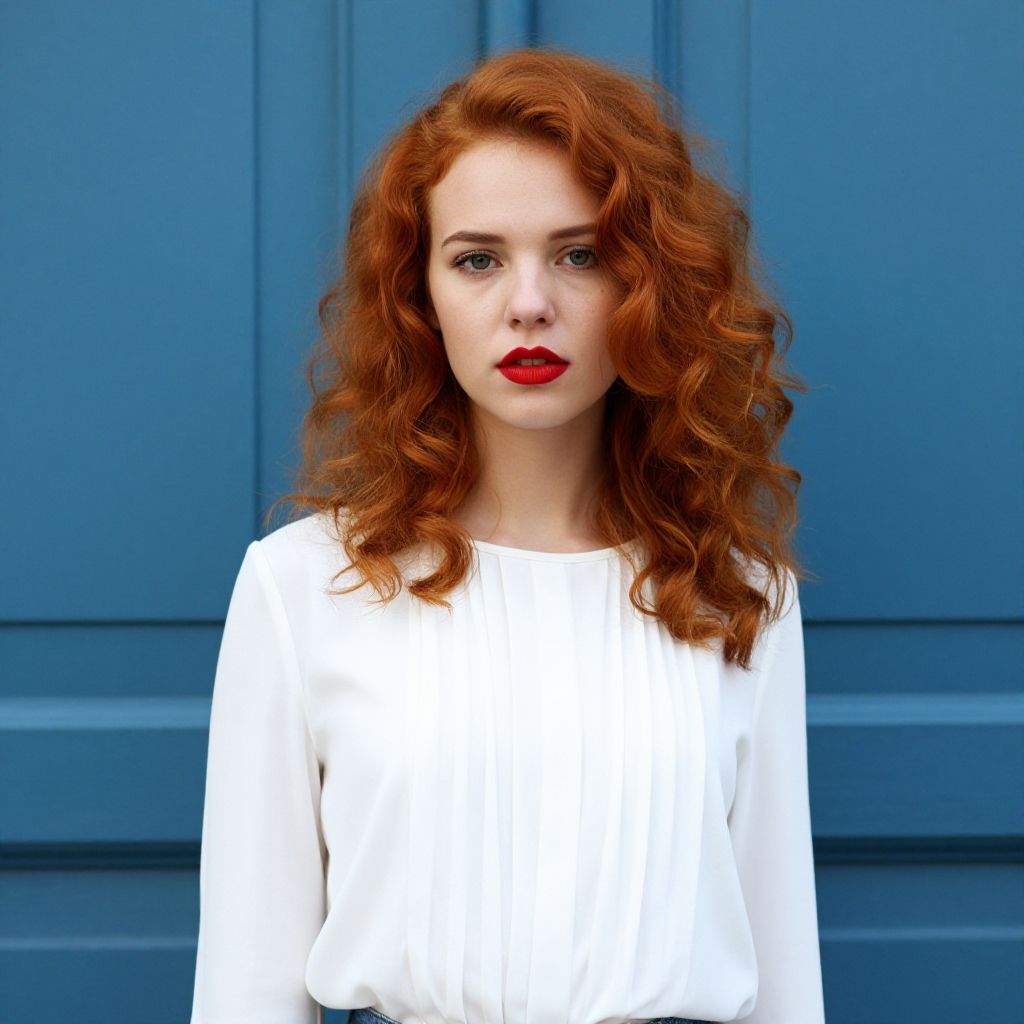A young woman with vibrant curly red hair and red lipstick stands against the frame of a blue wooden building. She wears a white blouse with vertical pleats, exuding a natural and elegant look in this vivid, well-composed portrait.