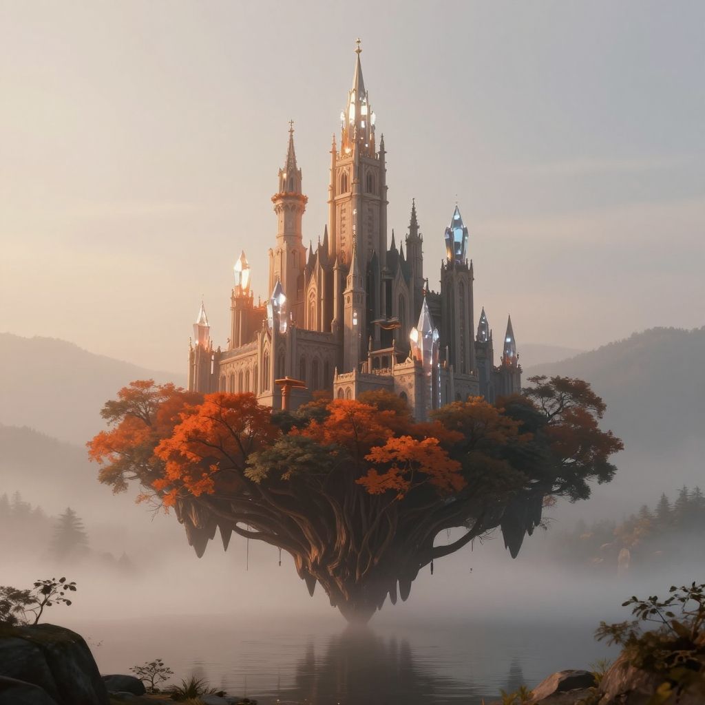 Photorealistic detailed digital illustration of a single large tree architecture castle, 8k, Floating spires crowned with glowing crystals in the background, misty clearing above with reflections, morning soft muted, hyper realistic aesthetic Sigma 308 ├в┬А┬Фw 20mm:4.0.3 carl sagan Max rutkowski, But Gravelphea UDJ edelweiss Martine, Cam 67 400D V855-27627238017278740 ISO40- 1/2 400, (Byzantineadic orange hue:1.33)