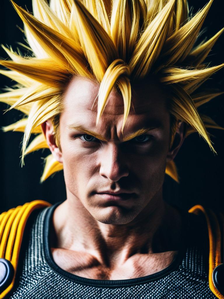Man in Super Saiyan Costume, close-up detailed headshot with spiky hair