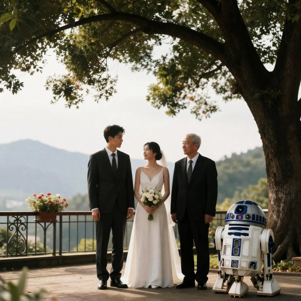 Photograph of a wedding scene. Bride in white dress, groom in dark suit, and older man in black suit stand under large tree. R2-D2 robot on right. Background: cloudy mountain landscape. Ornate balcony with flowers on left. Soft sunlight filtering through leaves. Silhouetted figures, gentle light, peaceful atmosphere.