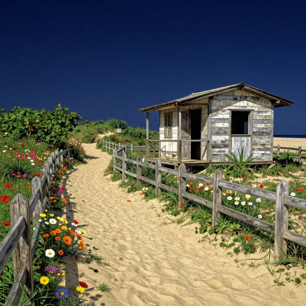This vivid digital illustration depicts a weathered, white wooden shack with a slanted roof standing on a sandy path. The path, bordered by a rustic wooden fence, is flanked by colorful wildflowers, including red, yellow, and white blooms. The bright, sandy ground contrasts with the deep blue, cloudless sky. Green bushes and grasses surround the shack and fence, adding lushness to the scene. The shack's front door and window are open, suggesting an abandoned, rustic charm. The image has a hyper-realistic, almost painterly digital style with bold colors and sharp contrasts.