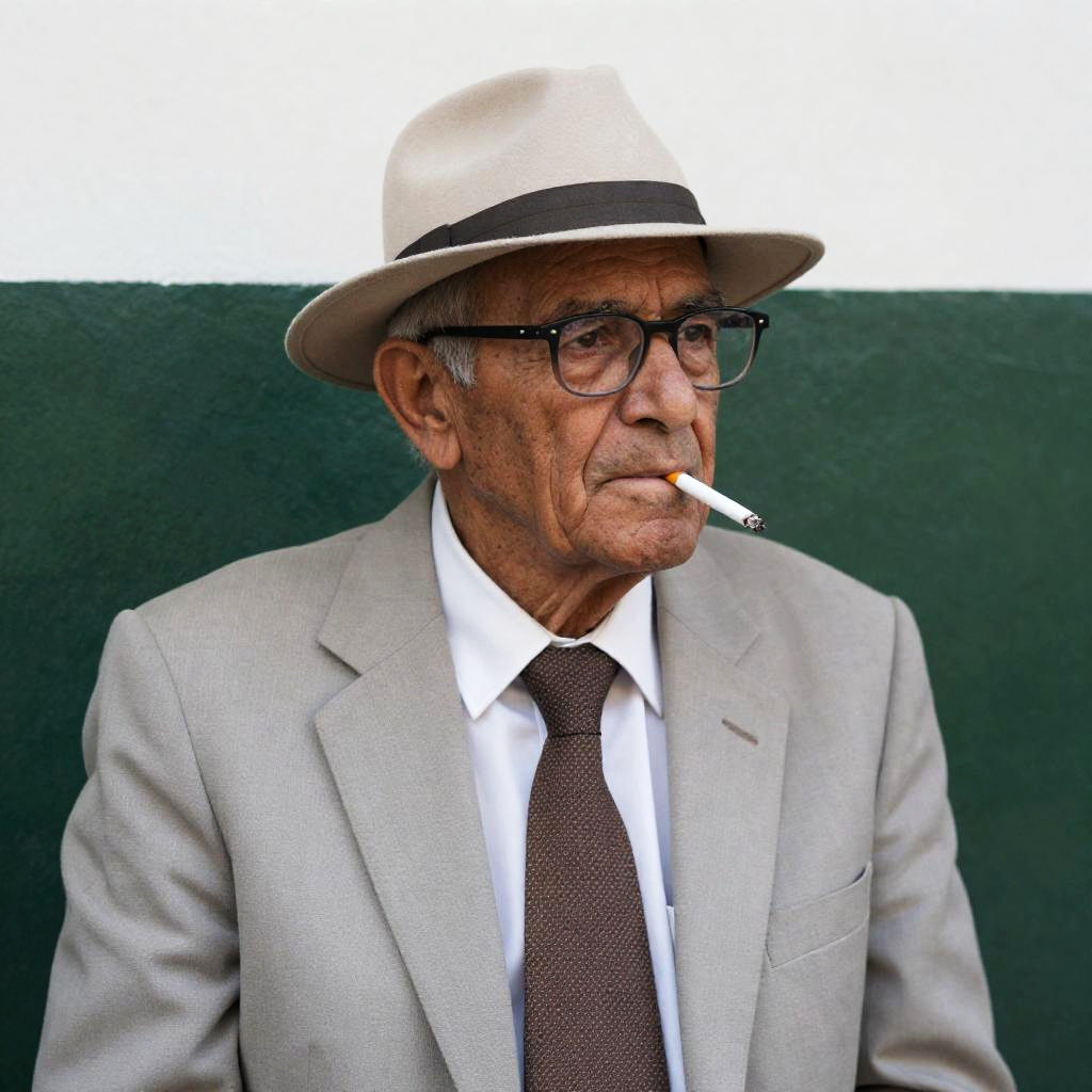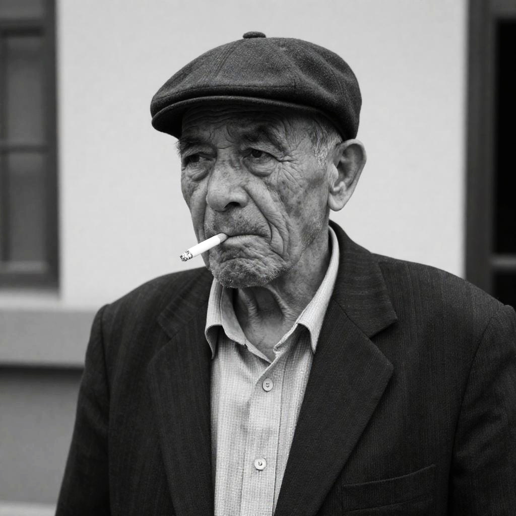 Black-and-white photograph of an older man with a cigarette in his mouth, wearing a dark striped suit, patterned shirt, and flat cap. He has a slightly furrowed brow, looking to the side. Background includes blurred objects and a wall.