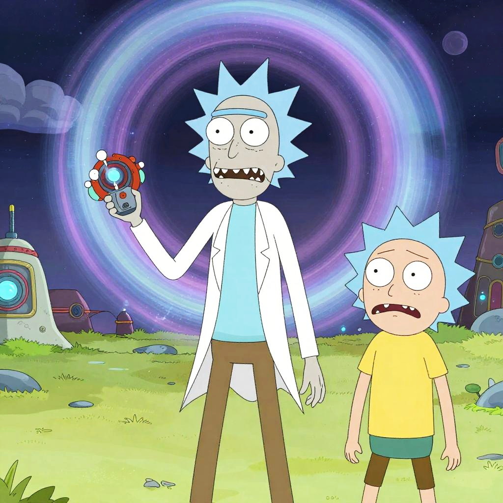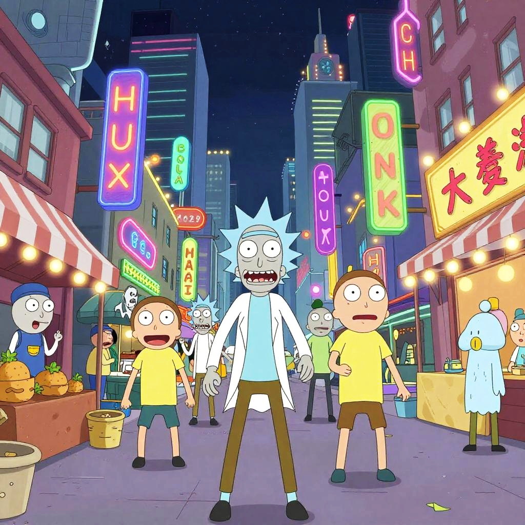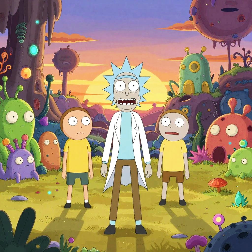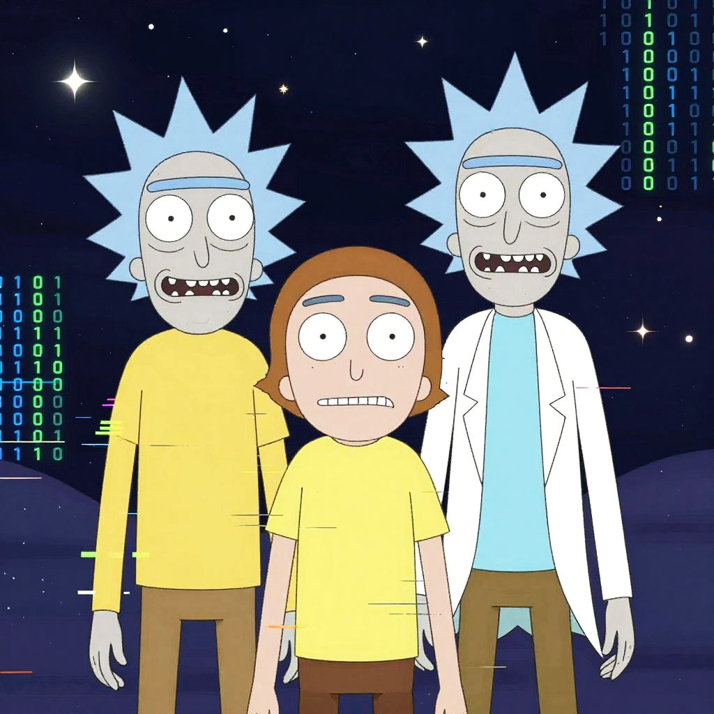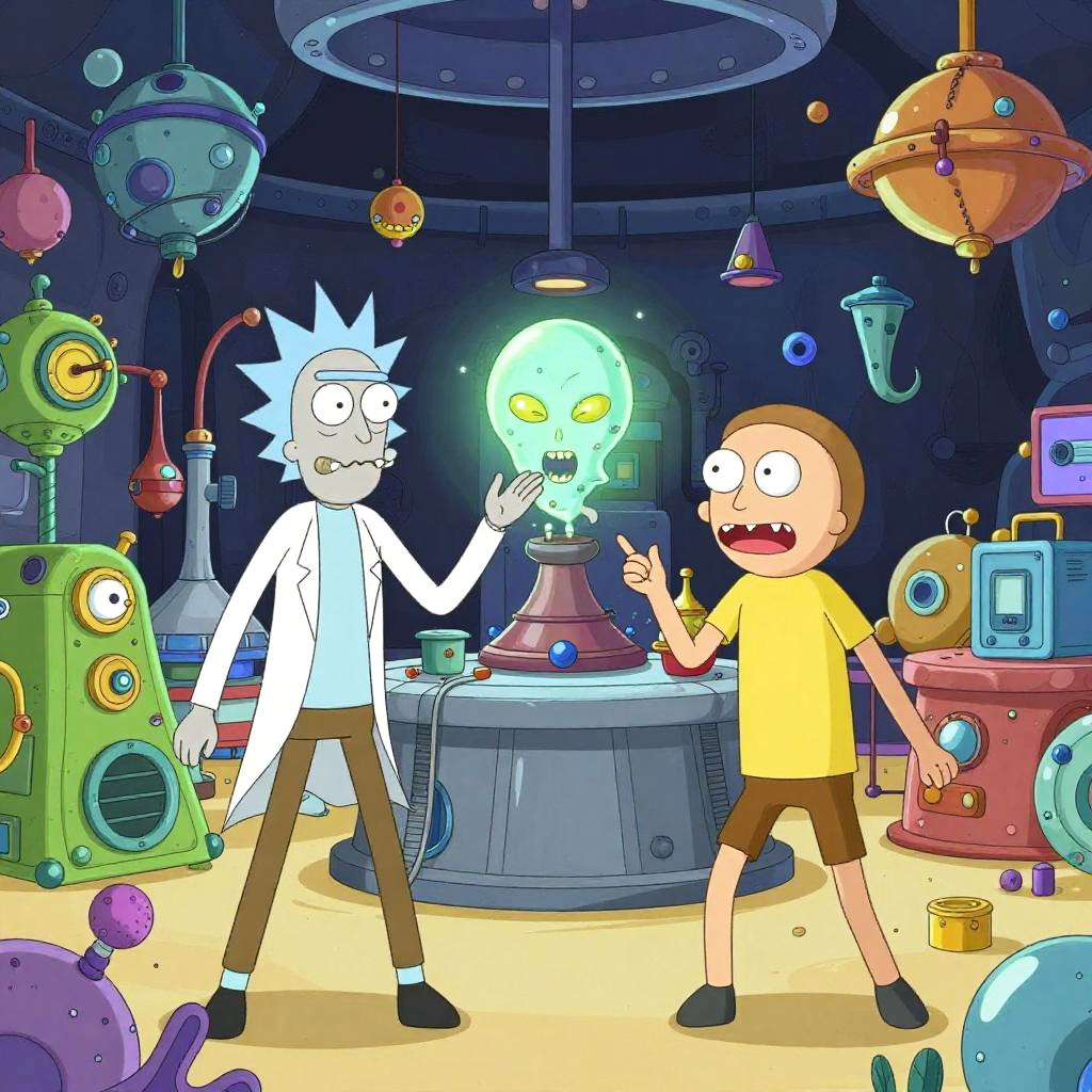 Rick and Morty AI characters in a digital universe, pixelated and glitch effects surrounding their forms, cosmic background with stars and binary code, a blend of humor and high-tech aesthetics, intricate circuit patterns integrated into their design