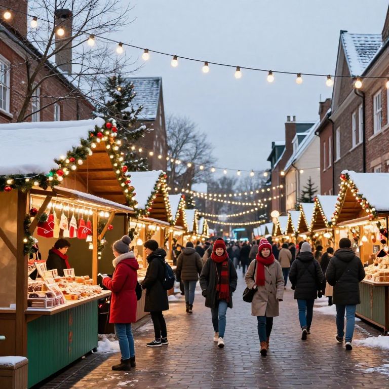 Google Christmas background images portraying a festive market street with colorful stalls selling holiday treats, strings of lights overhead, people wrapped in scarves and hats, and snow-covered rooftops, embodying the joyful spirit of Christmas celebrations.