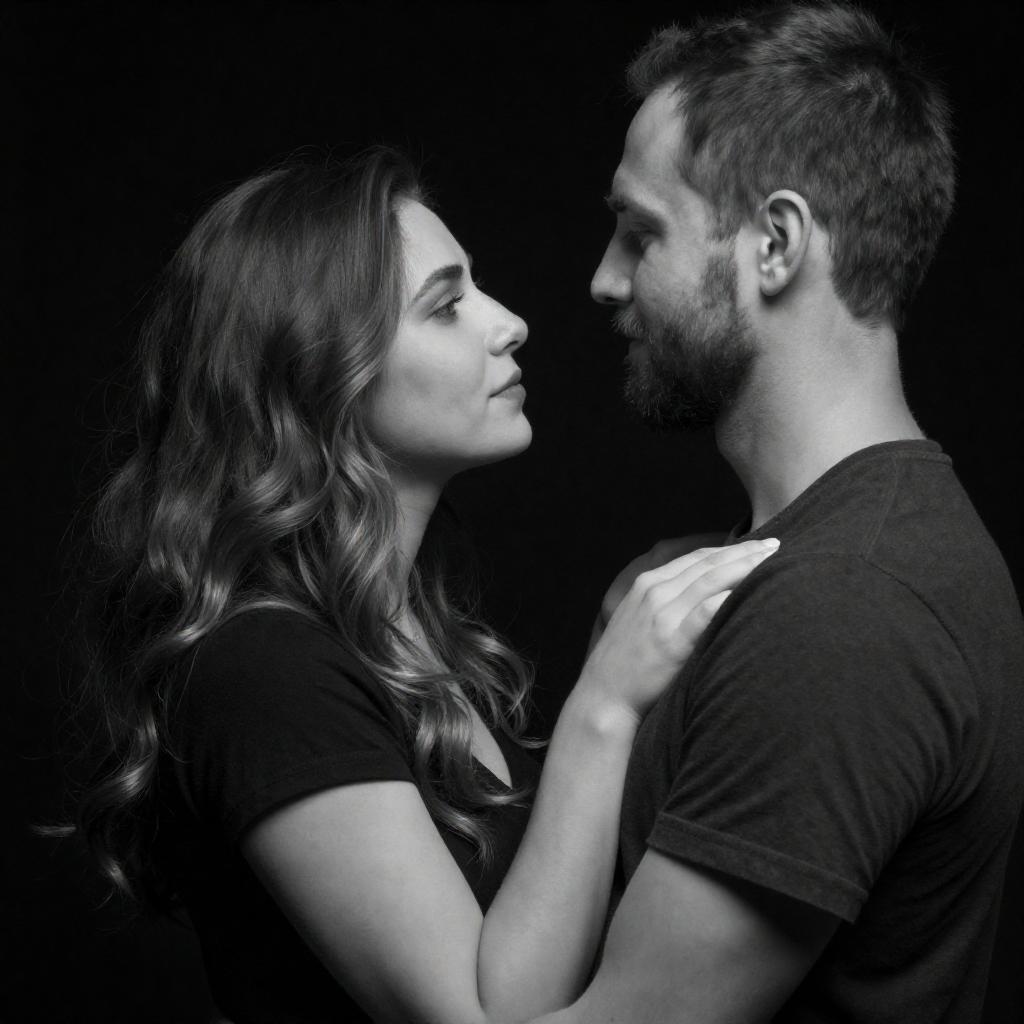 Black-and-white photograph of a smiling woman with wavy dark hair leaning back, eyes closed, facing a smiling man with short hair and a striped shirt. They are close, almost touching foreheads, against a dark background. The woman's head is tilted back, creating a sense of intimacy and connection.