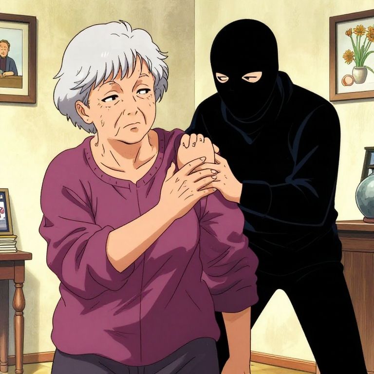 Anime-style drawing of an elderly woman with white hair, wearing a purple shirt, being restrained by a black-masked figure in a home. Background includes