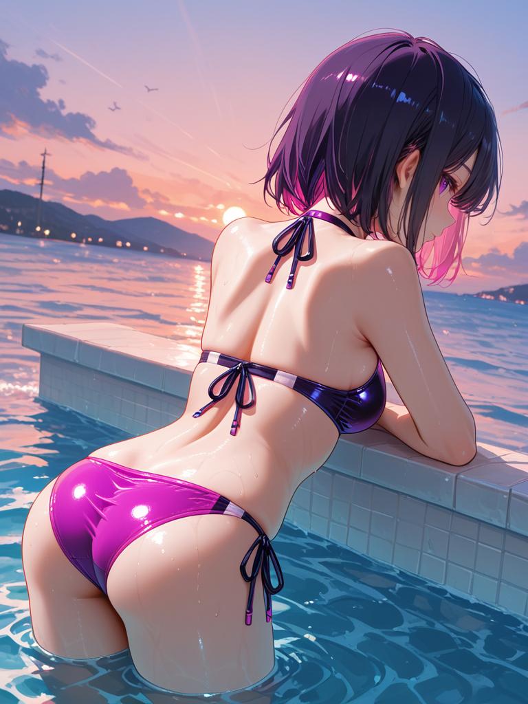 Anime Girl in Neon Bikini by Pool at Sunset