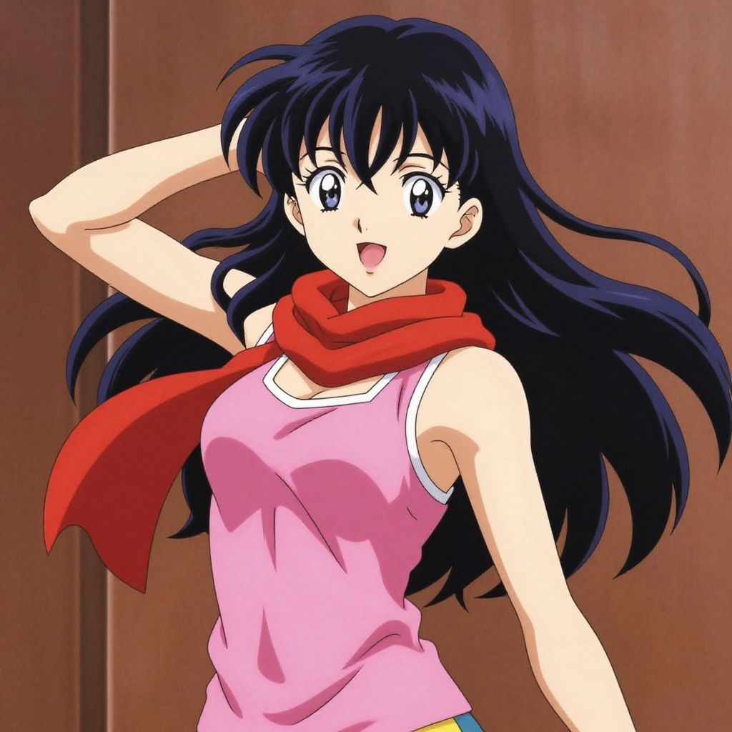 Anime-style digital drawing of a smiling young woman with long black hair, wearing a pink tank top, red scarf, and blue shorts. Brown wooden background
