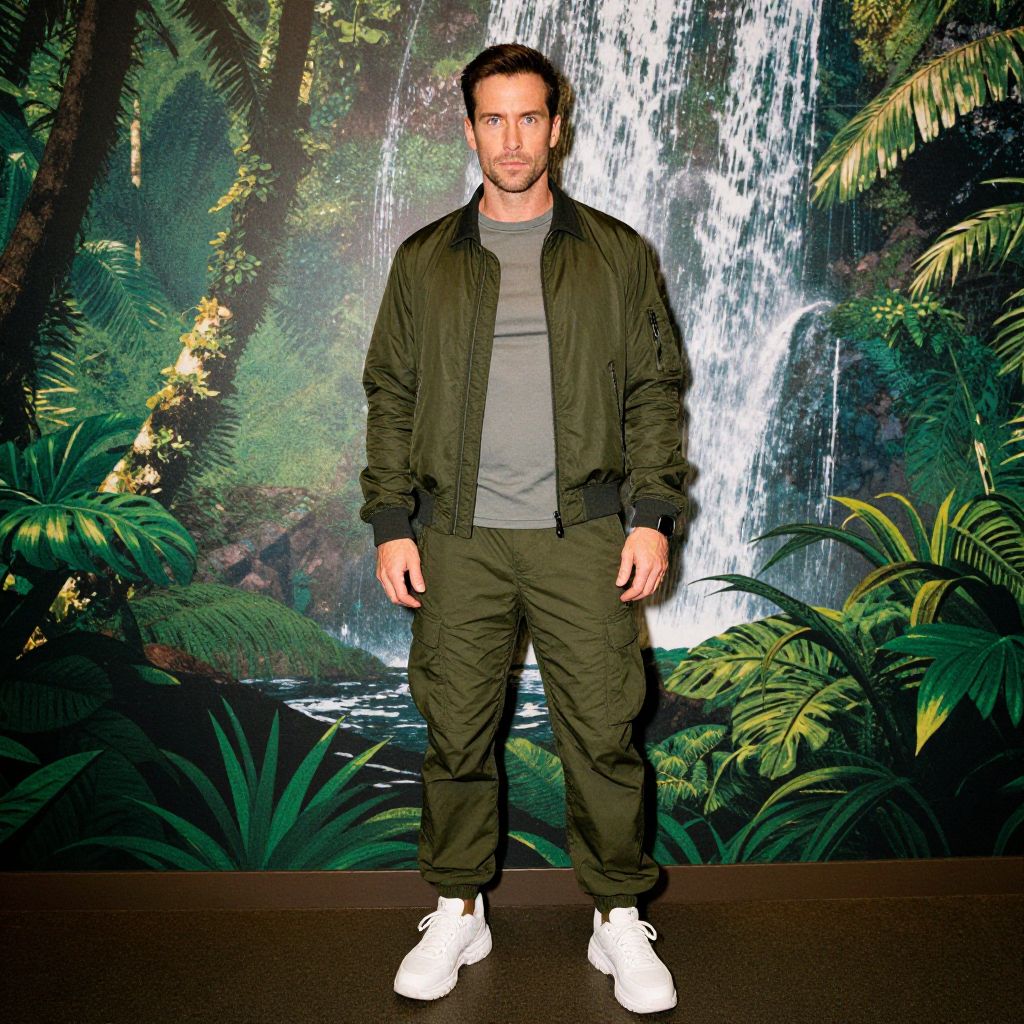 Photograph of a man standing in front of a vibrant jungle-themed backdrop featuring a cascading waterfall and lush green foliage. The man has short brown hair, a trimmed beard, and is wearing a dark green military-style jacket over a gray t-shirt, paired with matching dark green cargo pants and white sneakers. He has a medium build and stands with a neutral expression, hands by his sides. The lighting is bright, highlighting his outfit and the vivid background. The overall style is casual and adventurous, with a tropical, nature-inspired ambiance.
