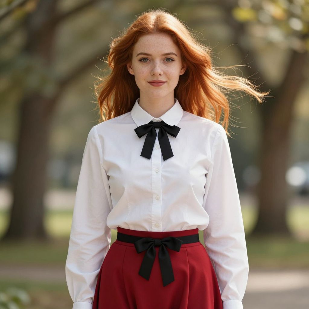 A young woman with vibrant red hair, flowing slightly in the gentle breeze, stands confidently in a soft daylight setting. She wears a neat white collar shirt that adds a refined touch, paired with a red skirt featuring a bold black bow at the top, giving her a classic and stylish look. Her expression is warm and composed, exuding elegance and quiet confidence. The sunlight filters through the trees, casting soft shadows and highlighting the textures of her clothing and hair. A light breeze adds subtle movement to her red hair and the skirt, enhancing the fresh, natural atmosphere. The overall vibe is elegant and fresh, blending vintage charm with modern simplicity, creating a timeless and inviting scene.