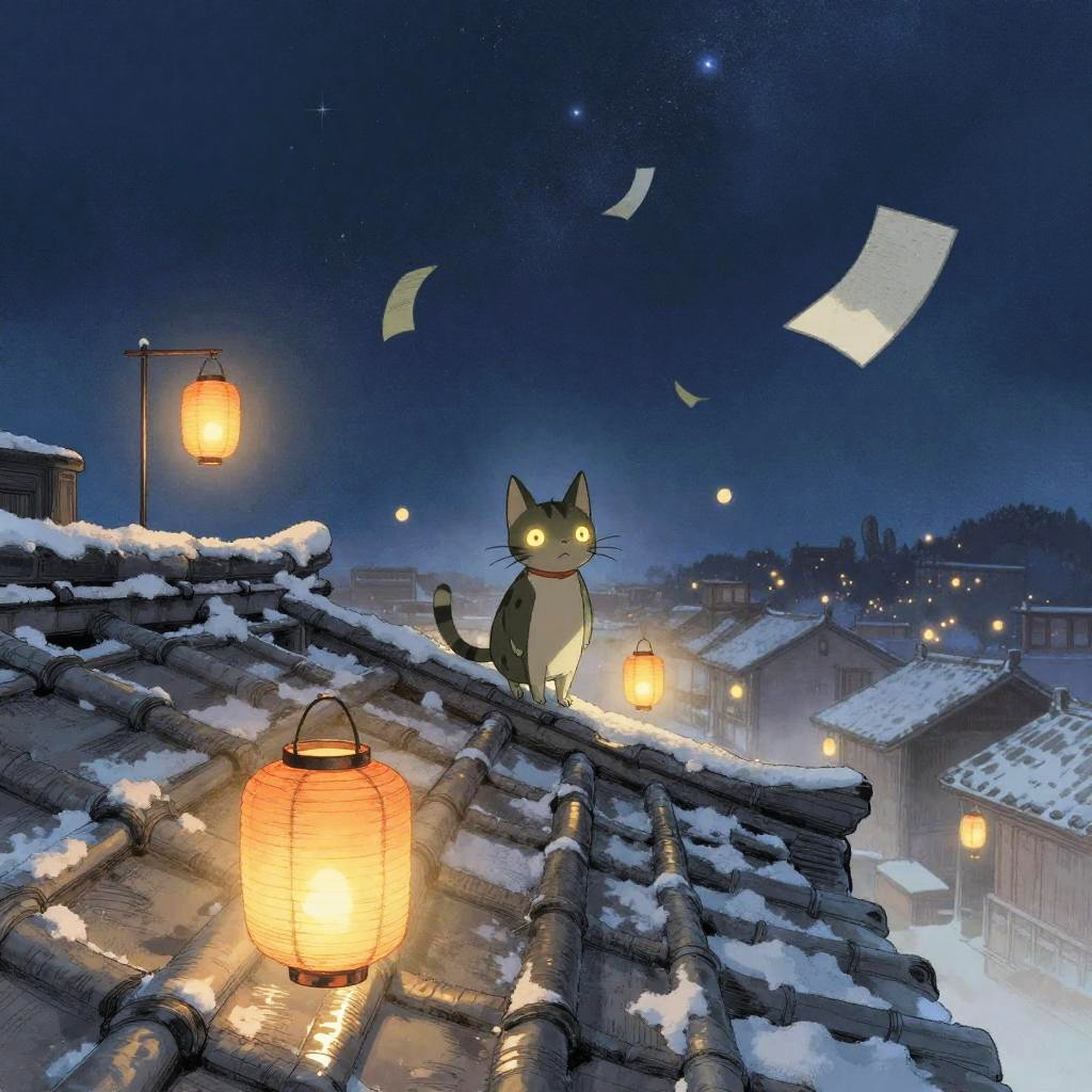 Fantasy-style illustration of a kitten-sized mystical creature with glowing eyes standing on a snow-covered rooftop adorned with glowing lanterns. The scene is set under a starry night sky with fluttering paper talismans, featuring delicate linework, soft edges, and a subtle washi texture. The environment resembles a traditional Japanese village with snow-covered rooftops and atmospheric volumetric lighting, evoking a serene and mysterious mood.