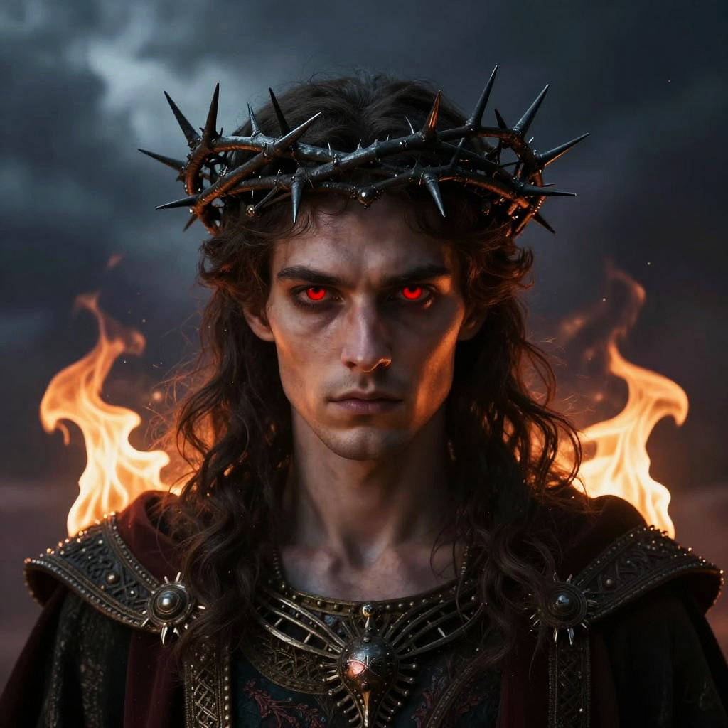 Portrait of Lucifer envisioned as a regal figure with a crown of thorns made of blackened metal, intense red eyes, and subtle flames flickering around the shoulders, evoking a mood of dramatic tension in a stormy, celestial setting.