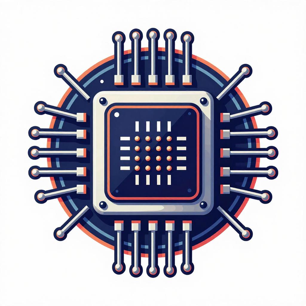 Assembly language logo, vintage computer chip design with integrated circuits and microprocessor motifs, retro tech style, detailed line art with neon highlights