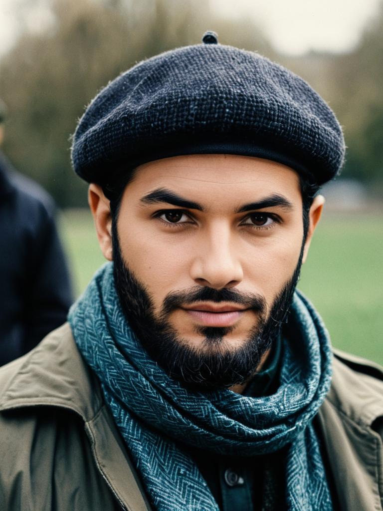 Islamic attire costume, 1boy, solo, male focus, realistic, hat, facial hair, looking at viewer, upper body, scarf, beret, outdoors, jacket, closed mouth, blurry background