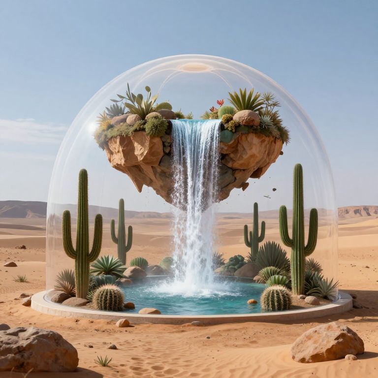 An ethereal oasis emerges from the barren desert, encapsulated within a luminous dome that cradles cascading waterfalls, verdant cacti, and floating islands—symbolizing hope and resilience amidst the harshness of isolation.