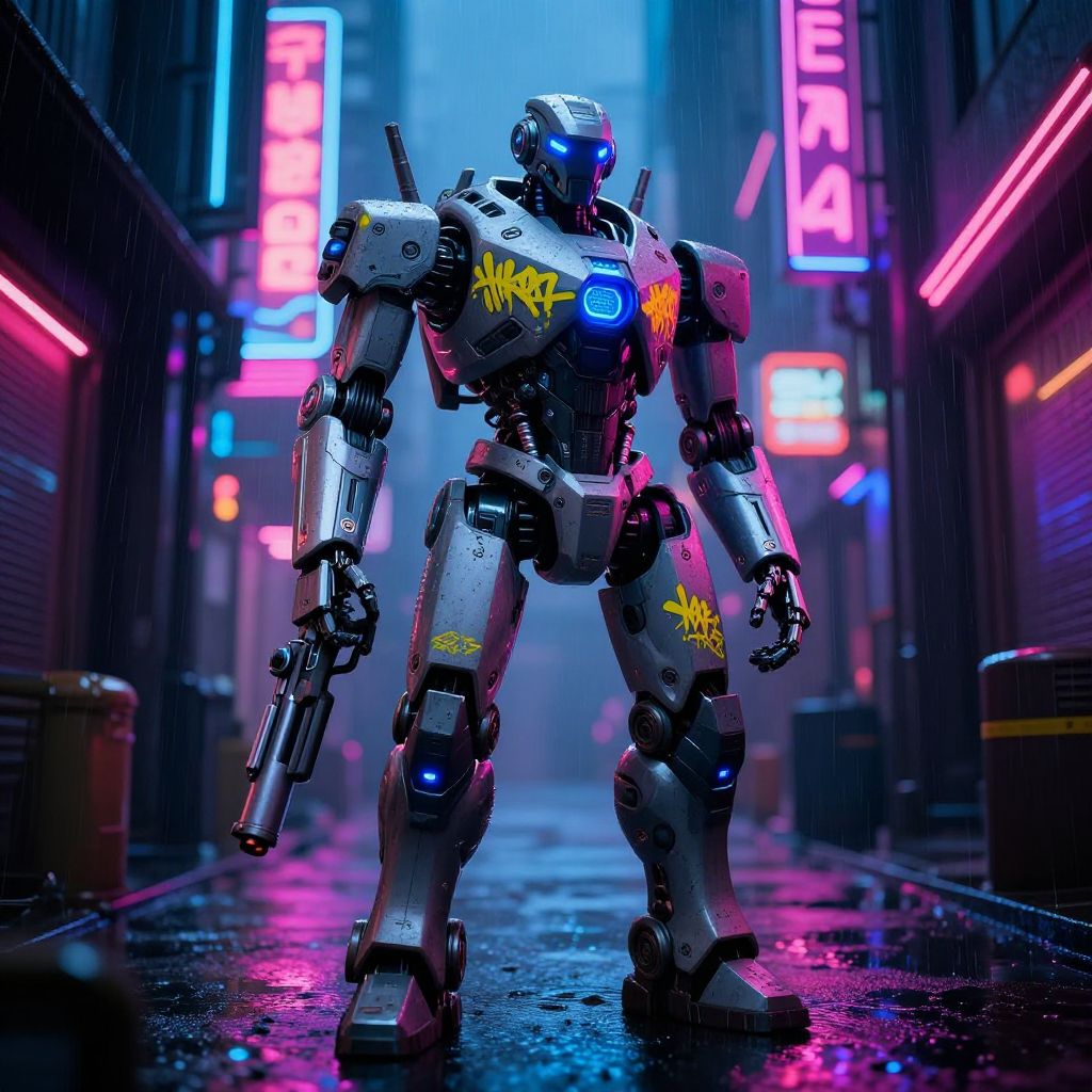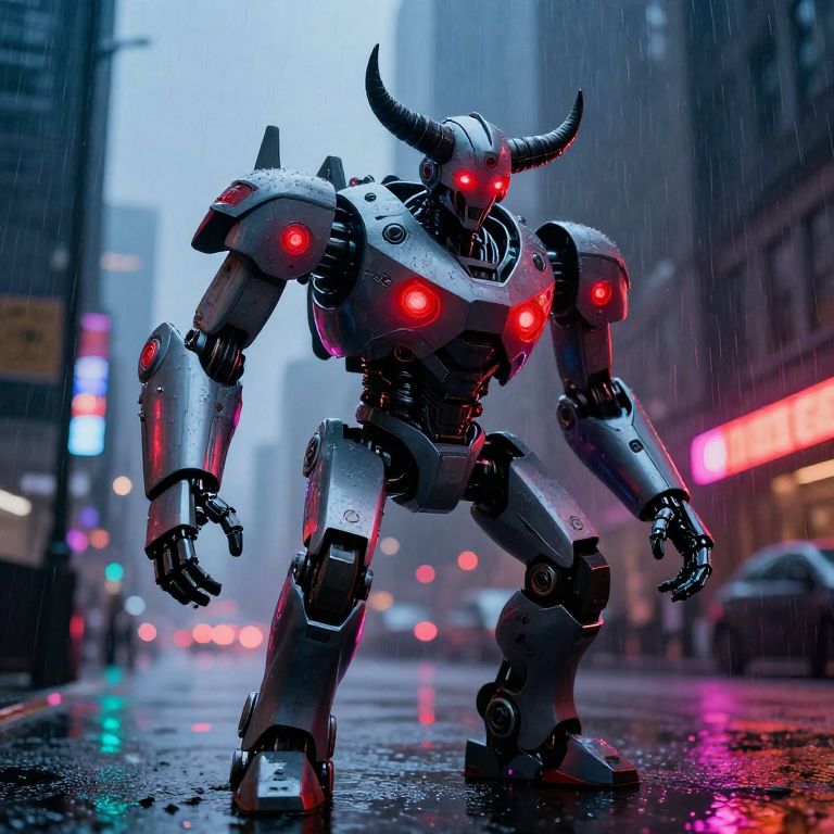 Futuristic robot with three feet long horns and multiple red glowing lights on its metallic body. The robot stands in a rainy urban street with dramatic lighting and vibrant reflections on the wet pavement. The background shows blurred city buildings and vehicles under a rainy atmosphere.