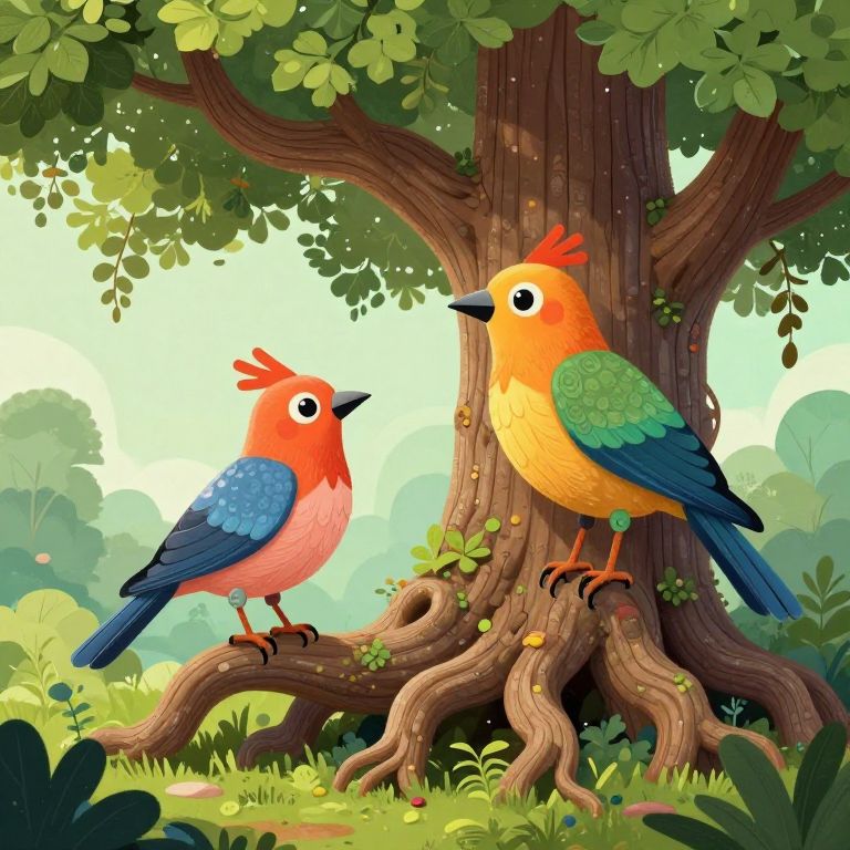 A whimsical digital illustration depicts two vibrant, mechanical birds perched on the gnarled roots of a colossal tree, their colorful plumage contrasting against the textured bark and lush greenery, evoking a fantastical world where nature and technology intertwine in a serene yet surreal setting.