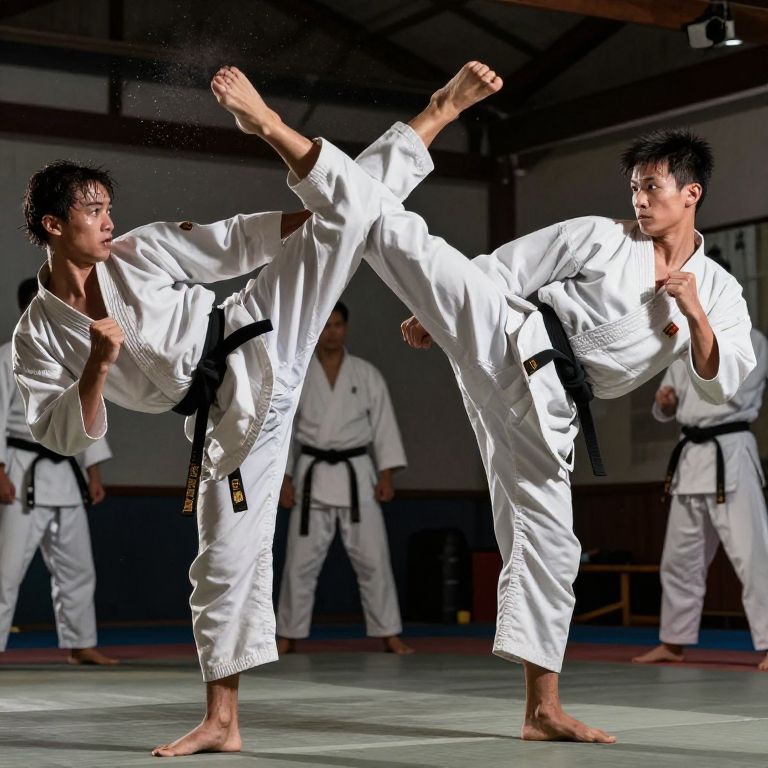 Photograph of two male martial artists in a dimly lit dojo, performing high kicks. Both wear white gi uniforms with black belts. The artist on the left has a medium build and short black hair, kicking his right leg high while balancing on his left leg. The artist on the right, also of medium build with short black hair, mirrors the kick. In the background, three other martial artists stand, observing. The dojo has a dark wooden ceiling and light-colored floor mats. The image is sharp with vibrant colors, emphasizing the motion and focus of the practitioners.