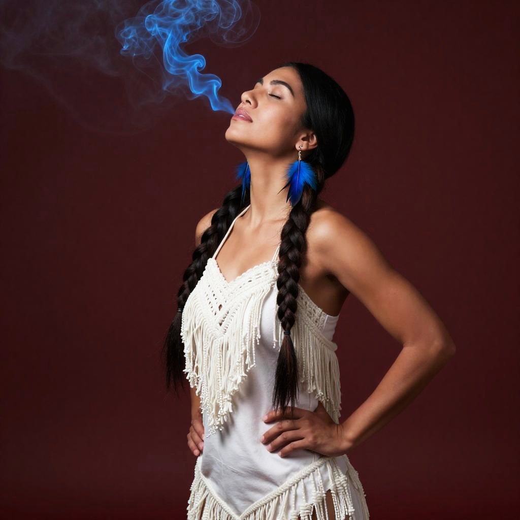 This digital art features a Native American woman with long, dark braided hair, wearing a white fringed dress and blue feather earrings. She's tilting her head back, eyes closed, with a plume of blue smoke curling around her. Her hands rest on her hips, and the background is a deep, smoky red. The image has a soft, dreamy quality with bright highlights.