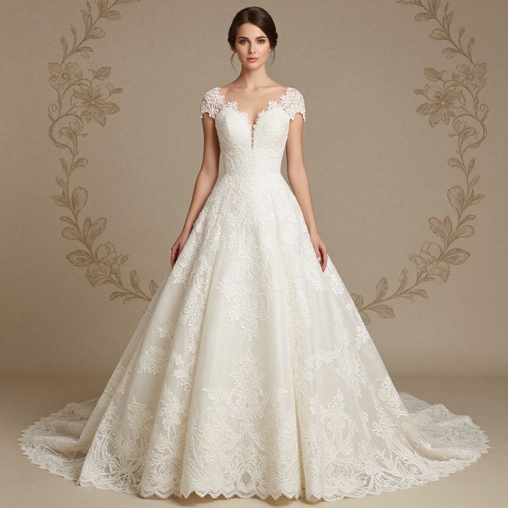 Photograph of a fair-skinned woman with dark brown hair in an elegant updo, wearing a full-length, white lace wedding gown with a deep V-neck and short, cap sleeves. The gown features intricate floral lace patterns and a long, flowing train. She stands against a beige background adorned with subtle, ornate floral motifs. Her expression is calm, and she gazes directly at the camera. The lighting is soft, highlighting the delicate textures and details of the lace.