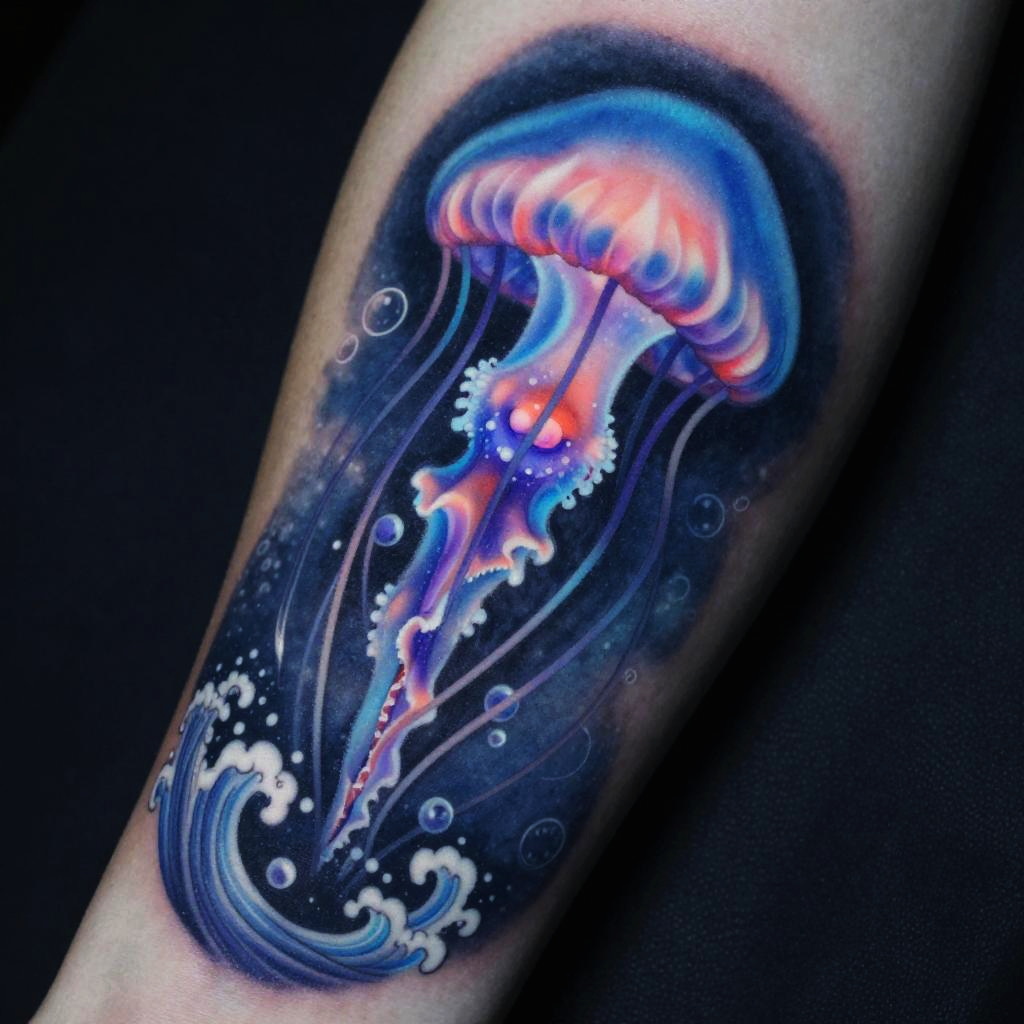 Jellyfish tattoo featuring a vibrant, bioluminescent jellyfish with intricate, flowing tentacles in shades of blue and purple, surrounded by delicate ocean waves and bubbles on a dark background, hyper-detailed and glowing