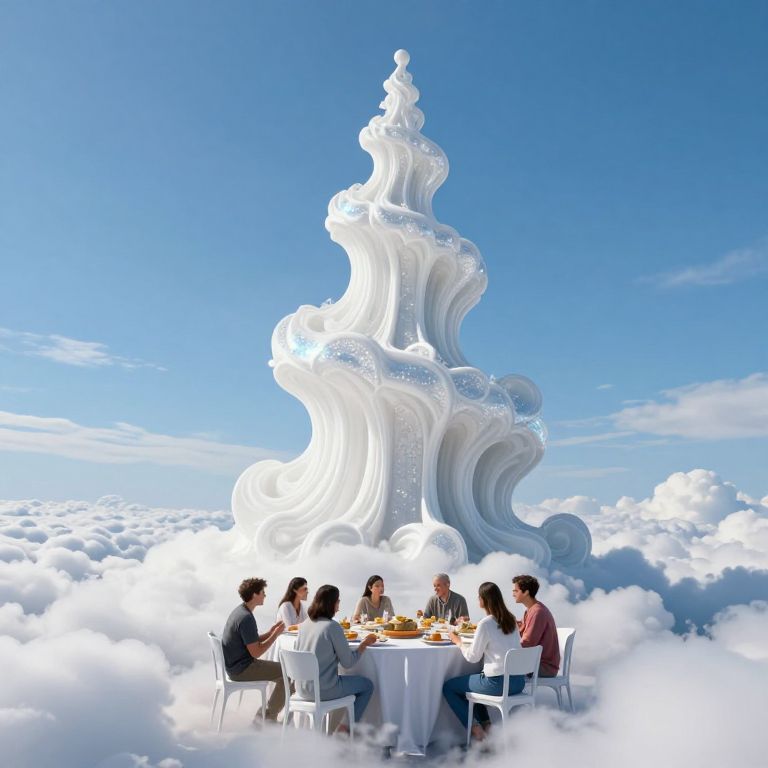 Photograph-like digital artwork depicting six people, three men and three women, sitting around a white table set with food on a fluffy cloud. They wear casual clothes, including blouses and jackets. In the background, a towering, white, sculptural structure with intricate, flowing designs rises into a bright blue sky with scattered clouds. The table is placed at the base of the structure, with the group facing each other. The overall scene is surreal, blending elements of fantasy and reality.