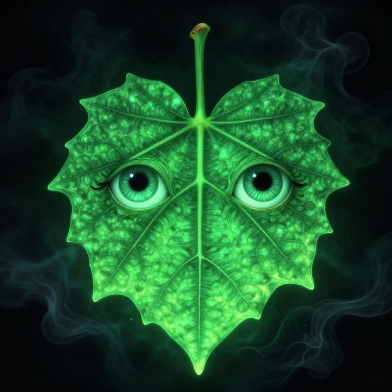 Digital artwork of a glowing green leaf with large, detailed eyes, set against a dark, smoky background. The leaf's veins and texture are vivid