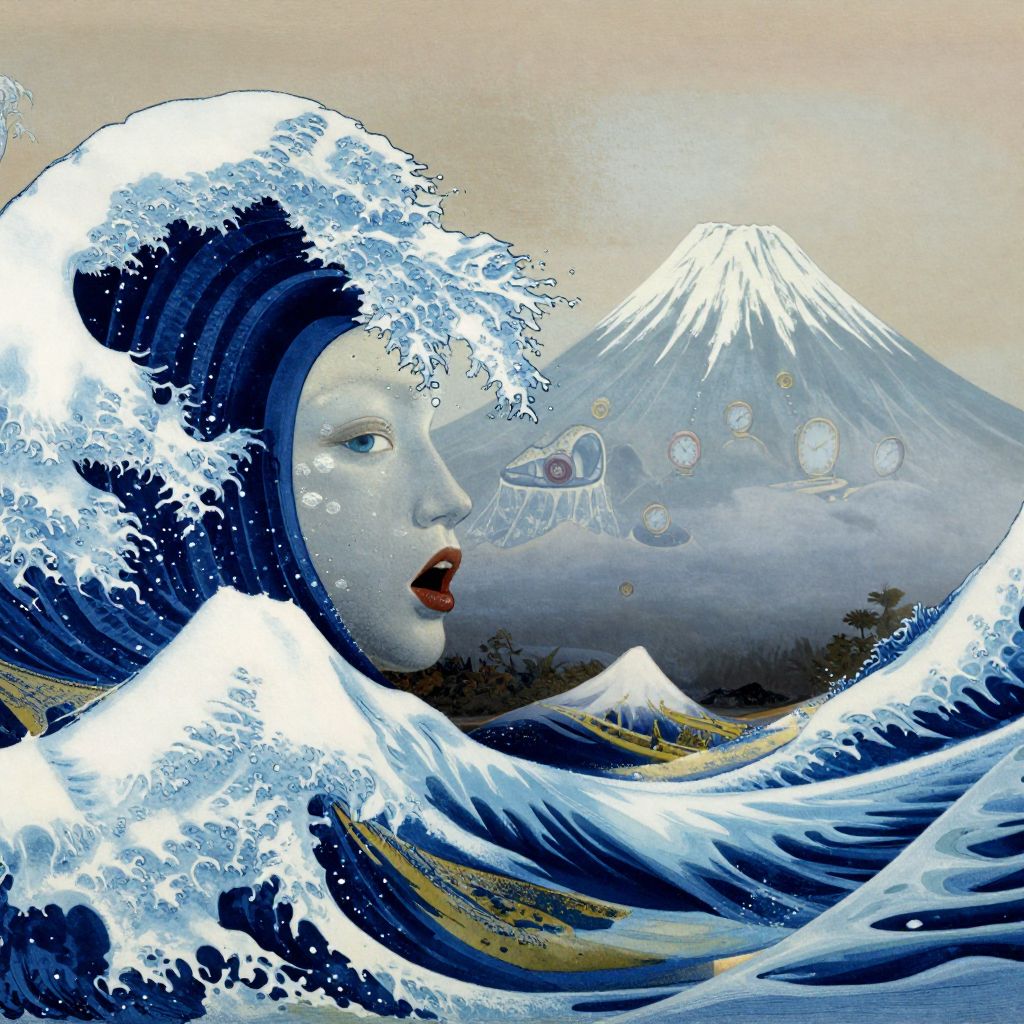 A surreal underwater dreamscape, this imaginative scene blends elements from Dali's dreamlike visions with Hokusai's iconic waves. A colossal wave takes the shape of a woman's face, her eyes as deep blue crests, and nose resembling Munch's famed scream, while her lips are the frothy foam at the breaking point. In the distance, Mount Fuji emerges from the water, its slopes adorned with whimsical clock-like features reminiscent of Dali's work. This hyper-realistic seascape captures every intricate detail of this fantastical underwater world, evoking a sense of awe and tranquility.