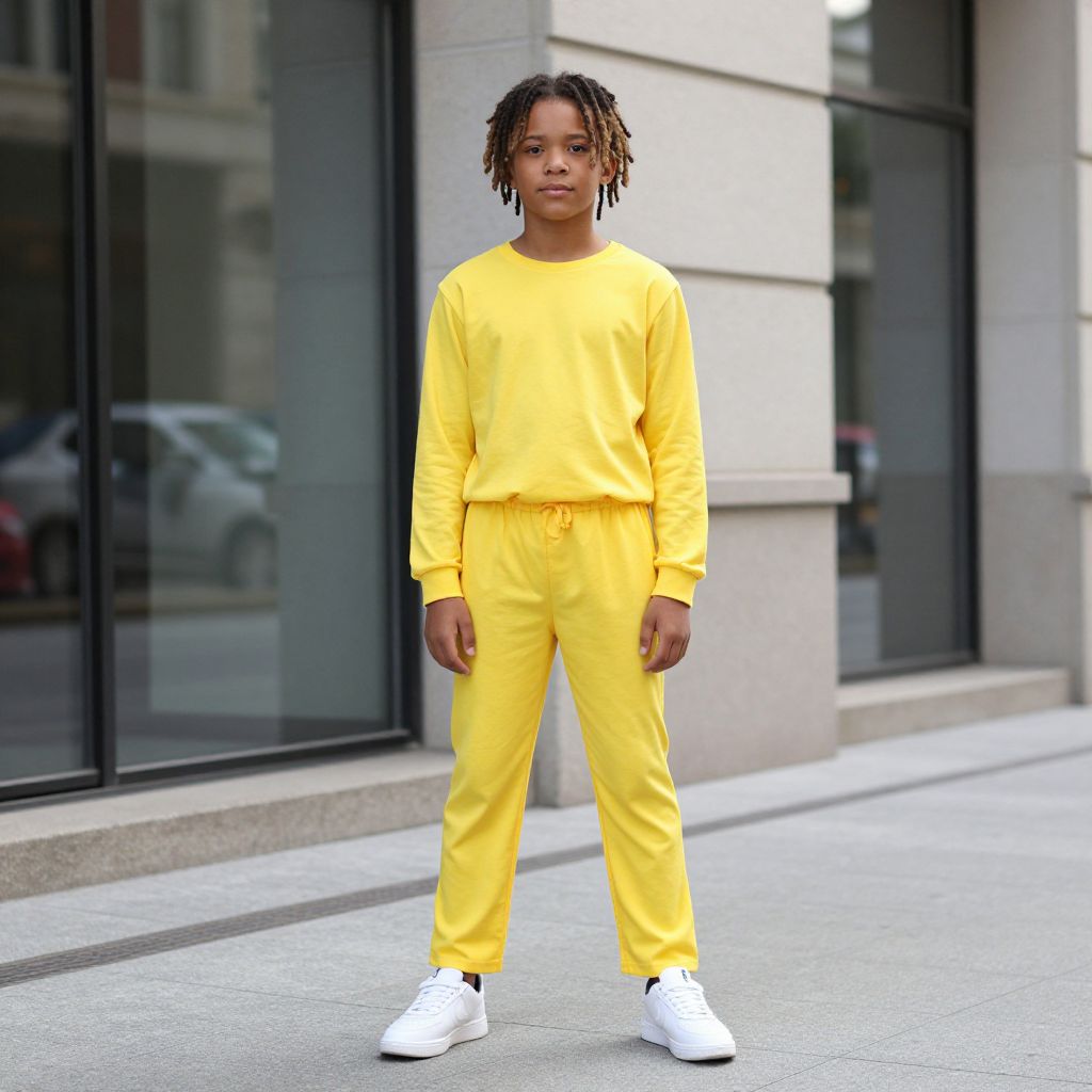 Photograph of a young Black boy standing on a city street. He has short, curly black hair and is wearing a bright yellow long-sleeve shirt and matching yellow pants, with white sneakers. His expression is neutral, and he stands with his hands by his sides. The background features a modern building with large black-framed windows and a reflection of a parked car. The street is gray and concrete, with a beige stone column on the right. The overall style is street fashion, with a bold, vibrant color palette.