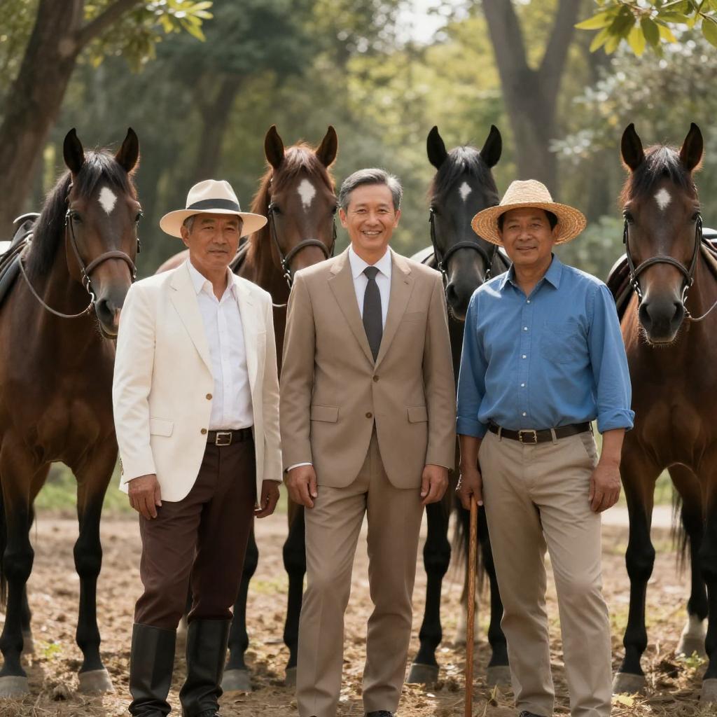 Photograph of three middle-aged Asian men standing outdoors in a forest clearing, surrounded by four brown and black horses. The man in the center is dressed in a tan suit with a white shirt and dark tie, smiling at the camera. The man on the left wears a white hat, white jacket, white shirt, brown pants, and black boots. The man on the right is dressed in a blue button-up shirt, beige pants, a straw hat, and is holding a wooden stick. Sunlight filters through the trees in the background, highlighting the natural setting.