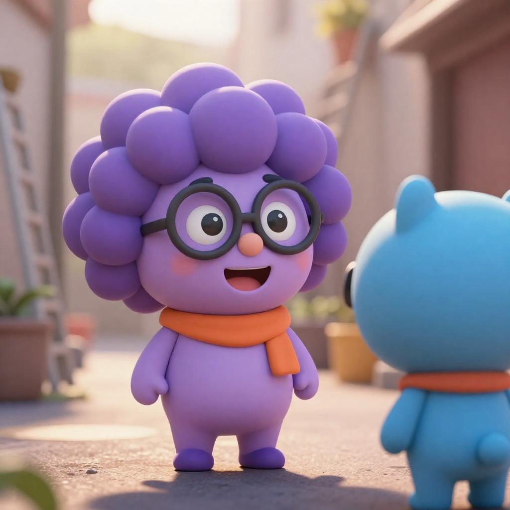 CGI image of two colorful, cartoonish characters in a brightly lit alley. Central character: purple, round, with curly hair, glasses, orange scarf, smiling widely. Right character: blue and purple, crouching, looking down. Background: blurred alley with ladders and sunlight.