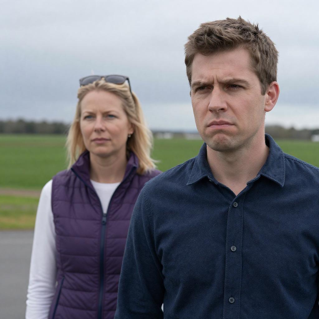 Portrait of a middle-aged woman and an older man standing outdoors in a grassy field with two brown horses between them. The woman has shoulder-length brown hair and is wearing a blue striped shirt with a maroon vest. The man has a white beard, wears a black jacket, brown pants, and a beige cap, and carries a black bag. Both people hold the horses' bridles with serious expressions. A small rural town is visible in the background under an overcast sky.
