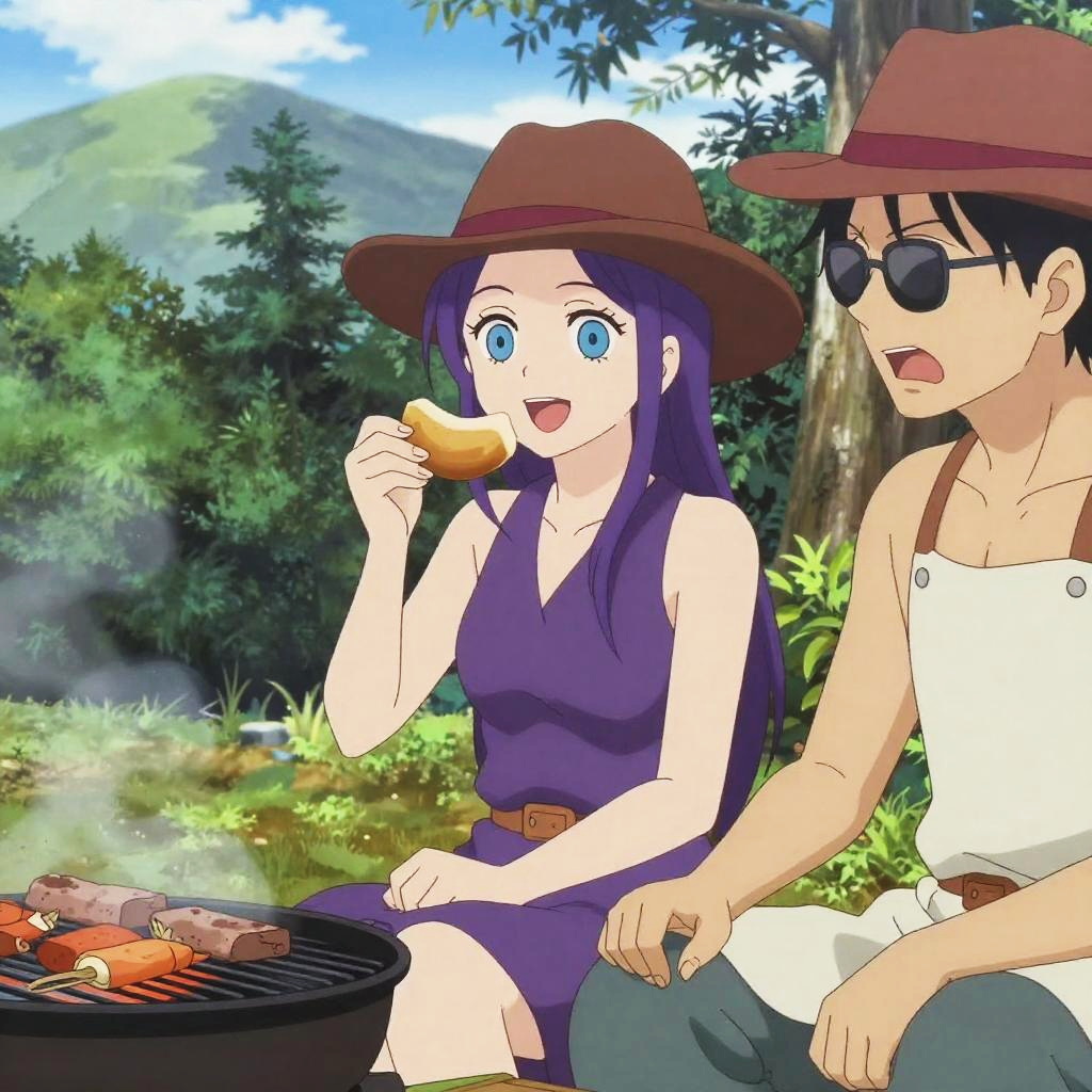 Cowboy shot, adachi rei, sitting, outdoors, nature, purple hair, blue eyes, smiling, holding food, purple dress, sun hat, sunglasses, mountain, tree, forest, day, grilling, with one friend, open mouth, wearing an apron
