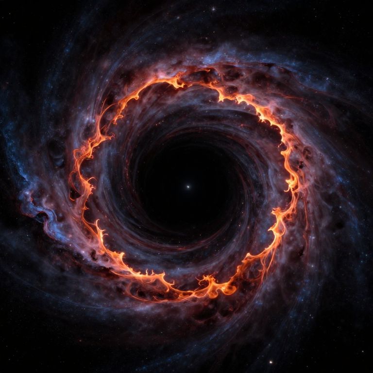 Vortex of cosmic wonder spirals through the starlit expanse, its fiery rim encircling a deep, enigmatic void that beckons the infinite.