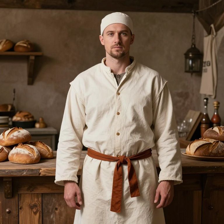 Medieval baker outfit, baker standing in front of a counter of bread