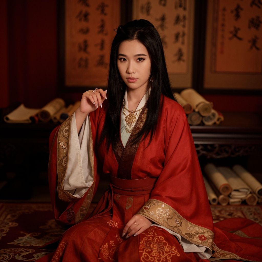 Photograph of an East Asian woman with long, straight black hair and fair skin, sitting on the floor in a traditional Chinese room. She wears a rich red silk robe with intricate gold embroidery on the sleeves and hem, over a white inner garment. Her right hand delicately touches her hair, while her left rests on her lap. The background features wooden panels with Chinese characters, rolled scrolls, and a patterned carpet. The warm, dim lighting highlights the rich textures and colors of her attire. Her expression is calm and composed.