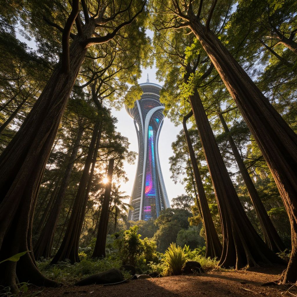 A sweeping panorama unveils an expansive, primordial forest where towering trees with contorted trunks and sprawling branches form a verdant ceiling overhead. Dappled sunlight from the golden hour paints the scene in warm hues, casting elongated shadows that hint at the tranquility and enigma of this ancient domain. Amidst this natural expanse rises a futuristic tower—a gleaming edifice adorned with sleek curves and vibrant holographic projections. The unexpected fusion of the ancient forest and modern structure sparks intrigue about the merging of nature's timeless beauty and technological advancement, beckoning observers to ponder the possibilities that emerge at their convergence. This harmonious blend of organic and artificial elements stirs a sense of reverence for the unknown, challenging our perceptions as we stand on the threshold of human ingenuity.