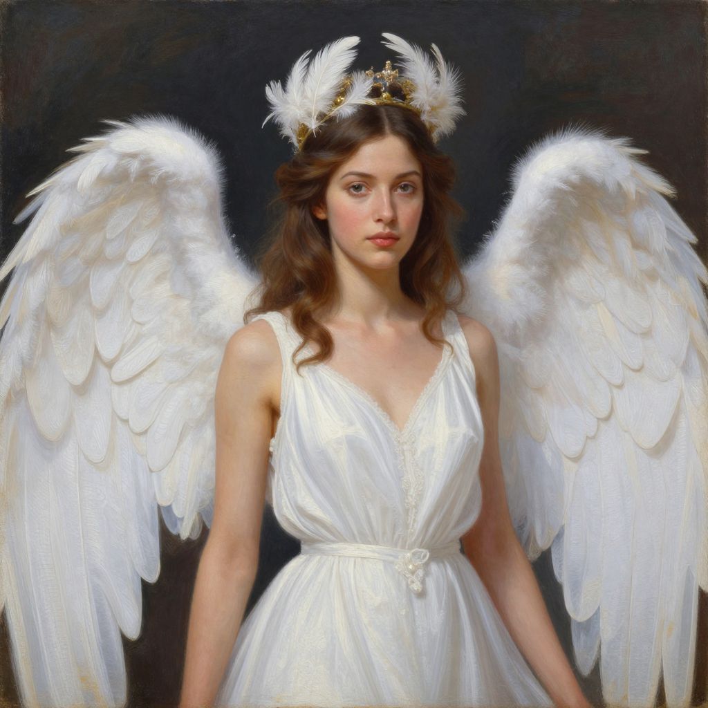 Digital painting of a young woman with long brown hair, white feathered wings, and a crown, wearing a white, sleeveless, V-neck dress