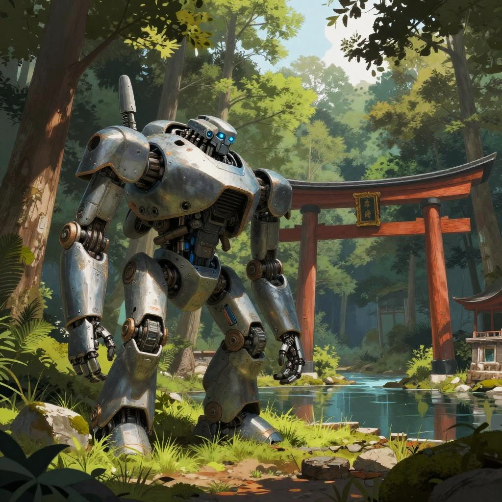 8k wallpaper, masterpiece, Cinematic Lighting, best quality, Illustration, detailed face depiction, dramatic angle, reflection, tree, nature, scenery, forest, outdoors, robot, grass, moss, water, ruins, torii