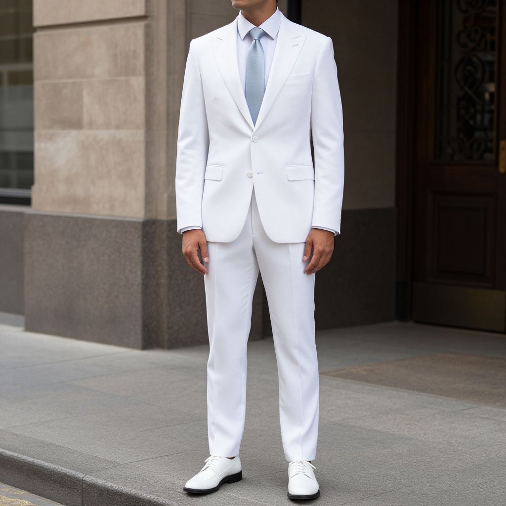 "White Suit Costume, man in a white suit standing on a sidewalk"