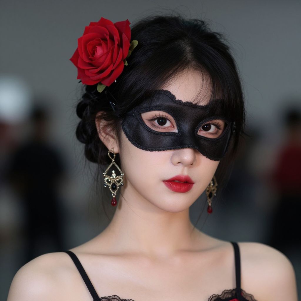"suspiria dance costume, 1girl, solo, flower, earrings, jewelry, hair flower, black hair, hair ornament, looking at viewer, blurry background, blurry, rose, red lips, mask, makeup, upper body, lipstick, red flower, red rose, black eyes Realistic photo of casual sexy person with pretty face"
