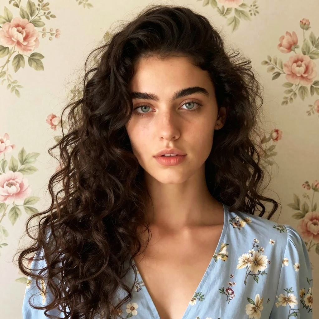 Photograph of a young woman with long, dark, curly hair and fair skin. She's wearing a light blue floral blouse with a deep V-neck. She has light green eyes, slightly parted lips, and a neutral expression. The background features a soft, floral-patterned wallpaper with pink and green flowers. The lighting is natural, highlighting her features and the texture of her hair.