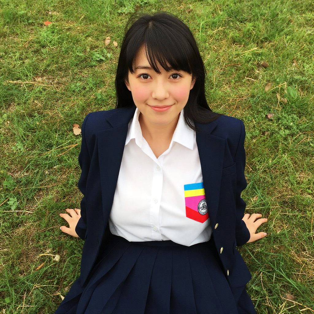 Masterpiece, absurdres, ultra-detailed, Yamada Anna, 1girl, solo, long hair, blush, large breasts, black hair, long sleeves, brown eyes, school uniform, jacket, white shirt, pleated skirt, collared shirt, blue skirt, blazer, cardigan, blue jacket, (realistic:0.35), smile, from above, looking at viewer, outdoors, sitting on grass, colorful, breast pocket, messy bangs