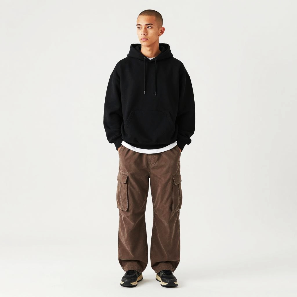 Young man, Muscular Build, Curly Afro, kelsey plum outfit, graphic sweatshirt, cargo pants, high-top sneakers, retro 90s