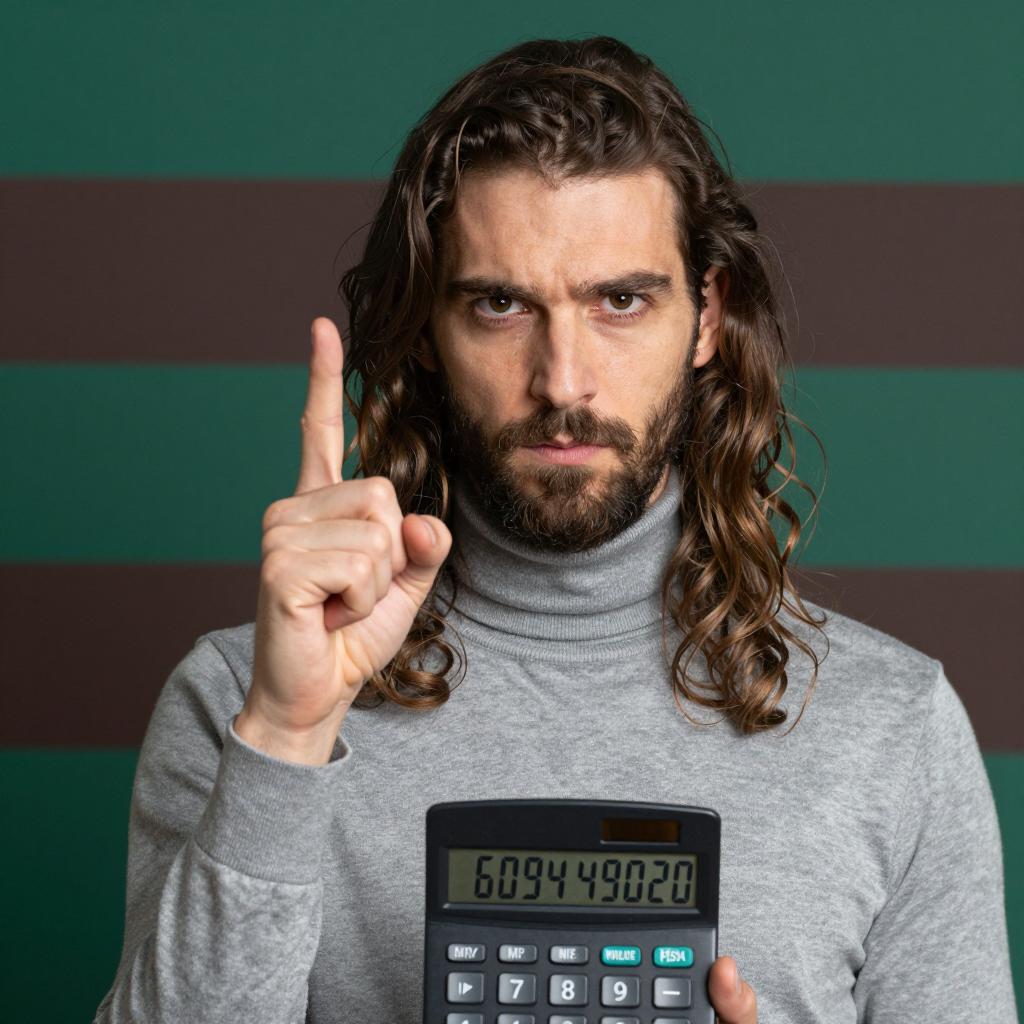Man with long, wavy brown hair and beard, wearing a gray turtleneck, holds up his right index finger. Behind him, a green and dark brown striped background. In front of him, a black calculator displays "6094 49020" and "CHIÈDE POLICE" below. Intense, focused expression on his face.