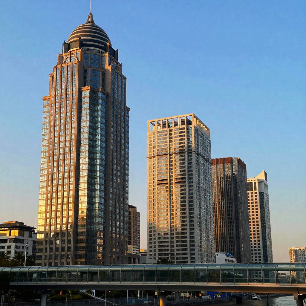 Photograph of a modern city skyline at sunset. The tallest building on the left has a distinctive, dome-shaped top with black and white stripes, and reflective glass. To the right, other skyscrapers with varying shapes and heights stand against a clear, blue sky. The sun casts a warm, golden glow on the buildings, creating striking reflections and shadows. A glass-walled pedestrian bridge spans the foreground.