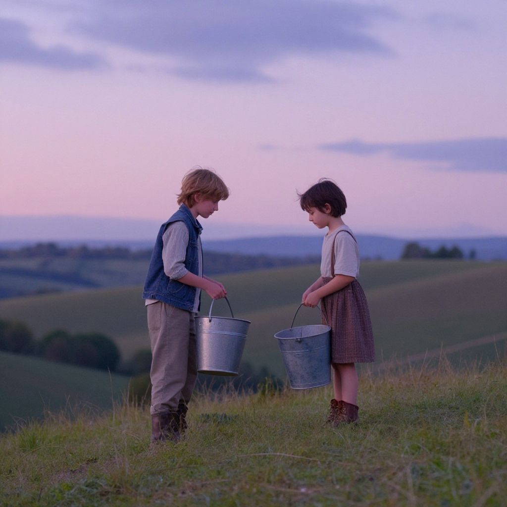 Jacknjill swap scene under a twilight sky, two children swapping buckets on a hill, soft pastel tones, dreamy atmosphere, gentle expressions, rustic countryside landscape, storybook art style