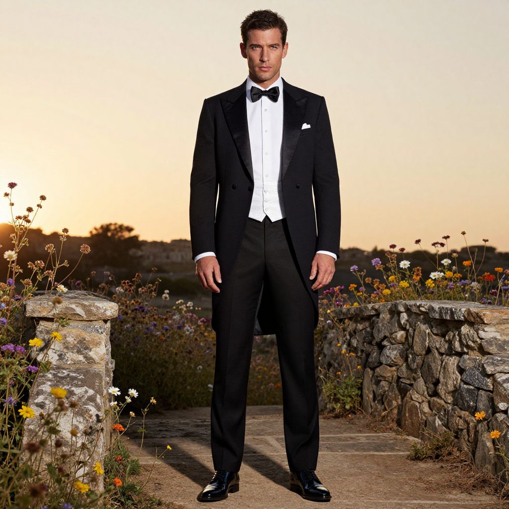 A man, classic black tailcoat, white dress shirt with wing collar, black silk bow tie, black trousers with a slight sheen, patent leather dress shoes, white waistcoat with subtle texture, crisp white pocket square, rustic stone arch bridge, vibrant wildflowers, serene sunset glow, cinecolor, confident expression. Man has masculine face and piercing eyes