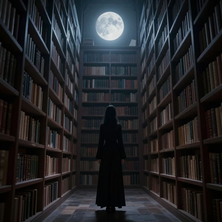In a hauntingly serene digital art rendering, a solitary figure in a flowing black gown stands amidst towering bookshelves under the ethereal glow of moonlight, casting an enigmatic ambiance over the silent library where stories awaken only when unobserved.