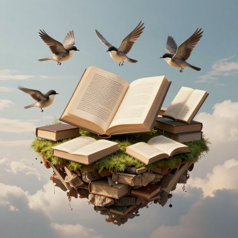 Digital illustration of floating books with open pages, surrounded by four flying birds, set against a bright blue sky with clouds.